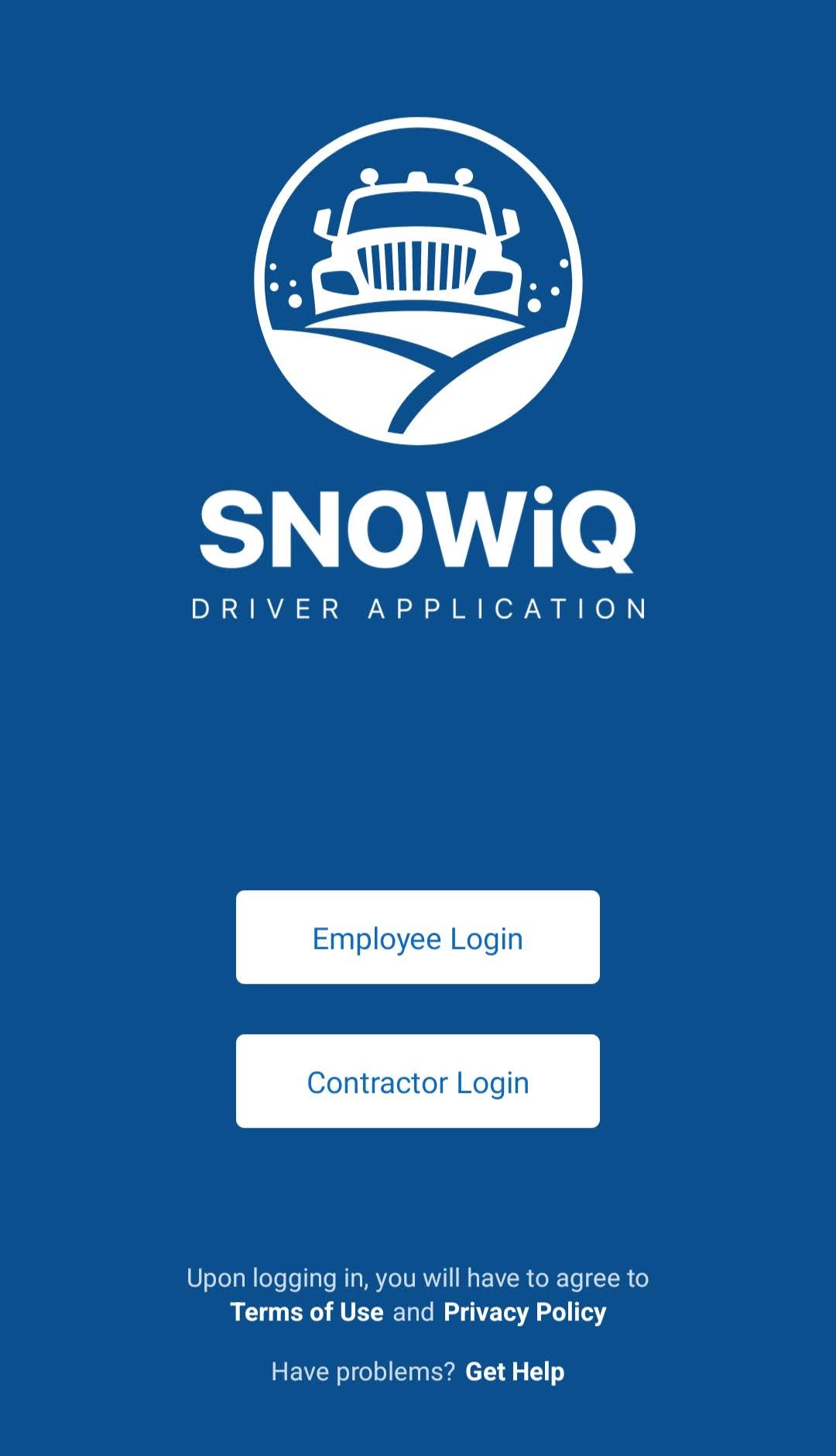 The login screen shown below allows a Driver to access the SNOWiQ Driver Application (DA). Click the appropriate ‘Login’ button to enter the assigned username and password for the application.