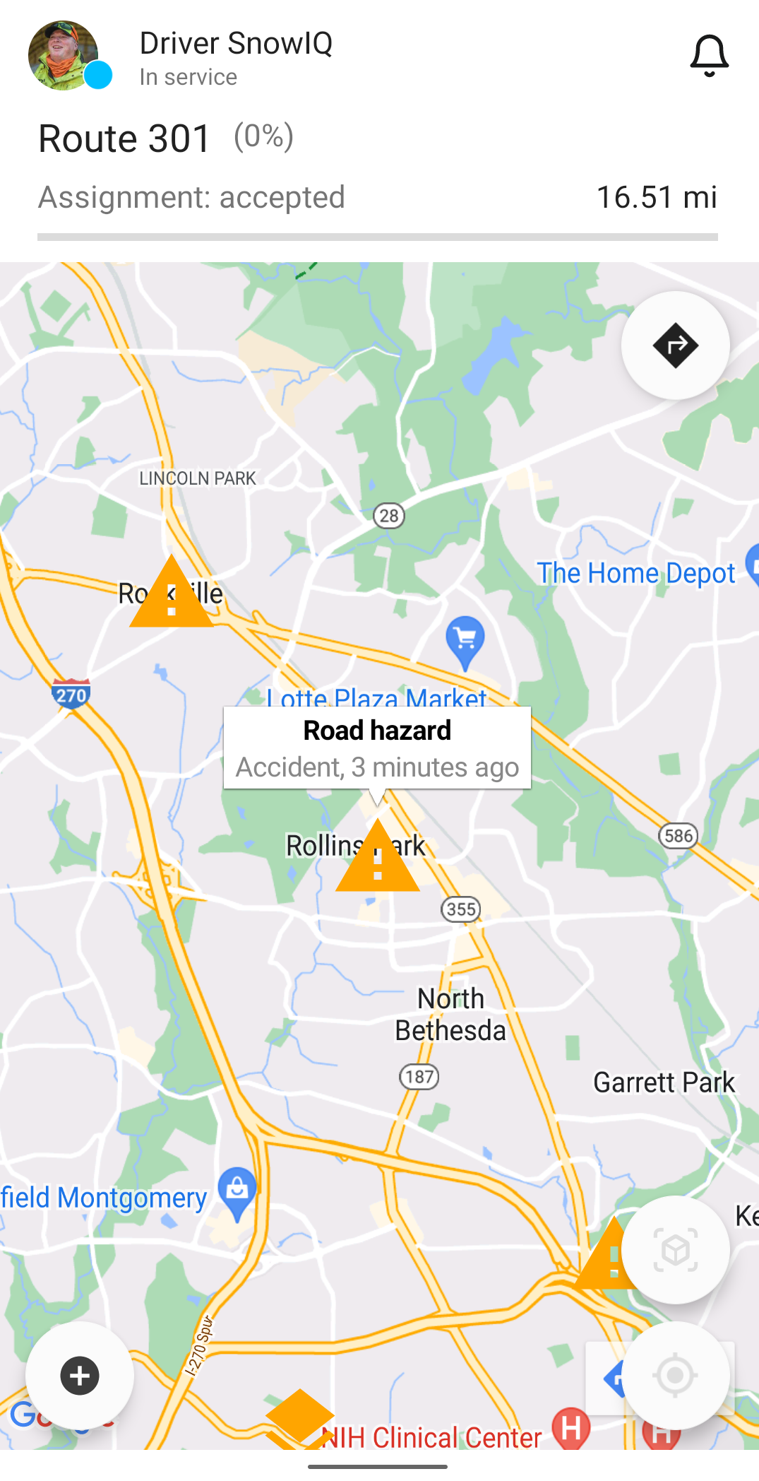 A Road Hazard is a marker icon on the map to inform users of reported road hazards. Users can view reported hazards on the map, and can also report new hazards to inform other app users working in the same service area.
