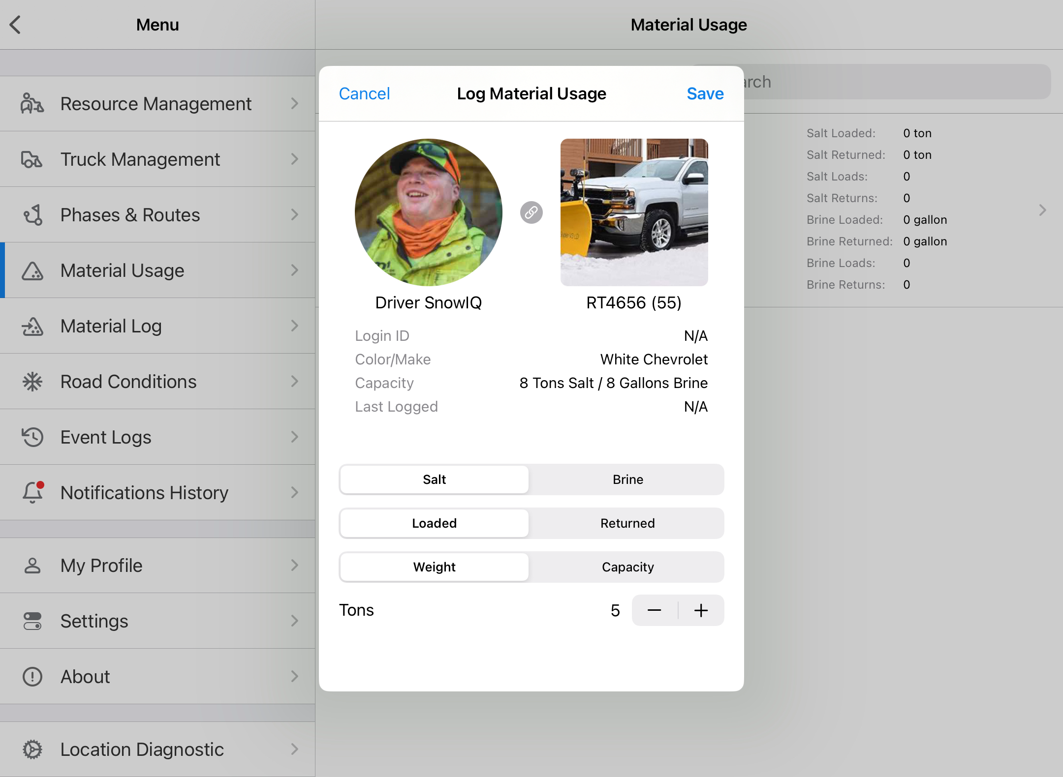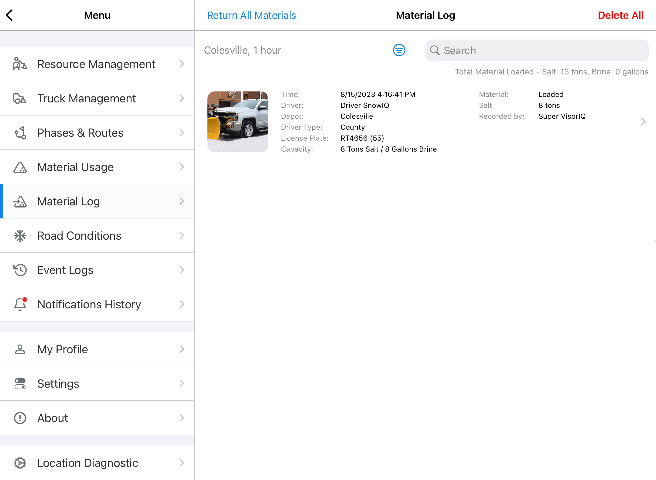 The Material Usage screen is accessible on the main menu of the Supervisor App.