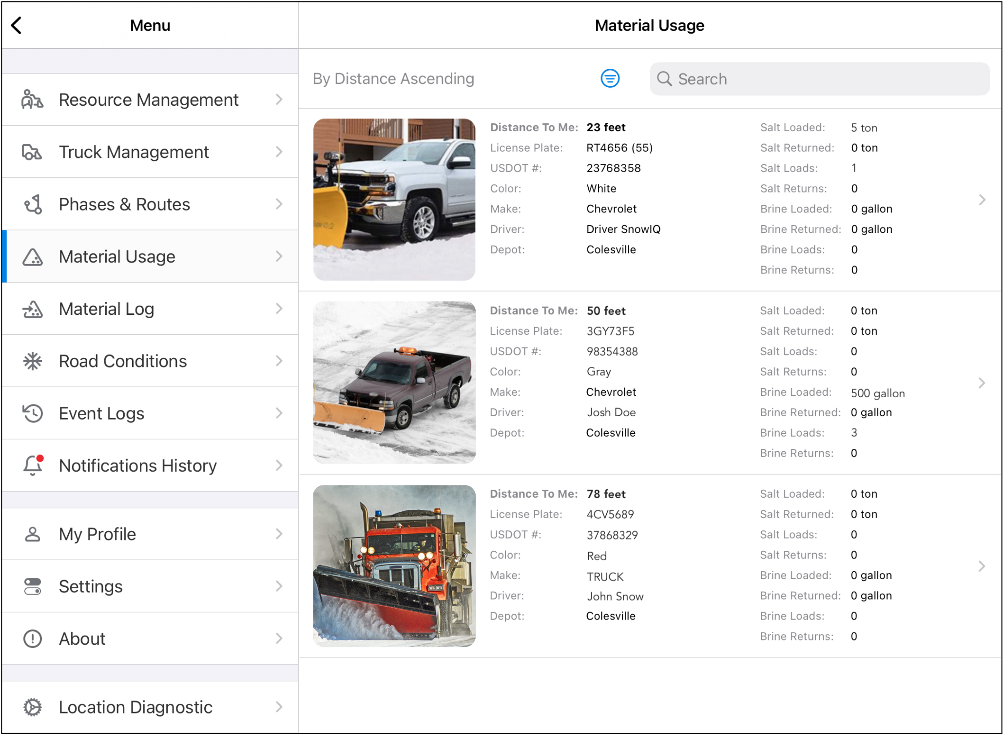 The Material Usage screen displays a list of trucks within a 100-foot radius of the user’s current position.