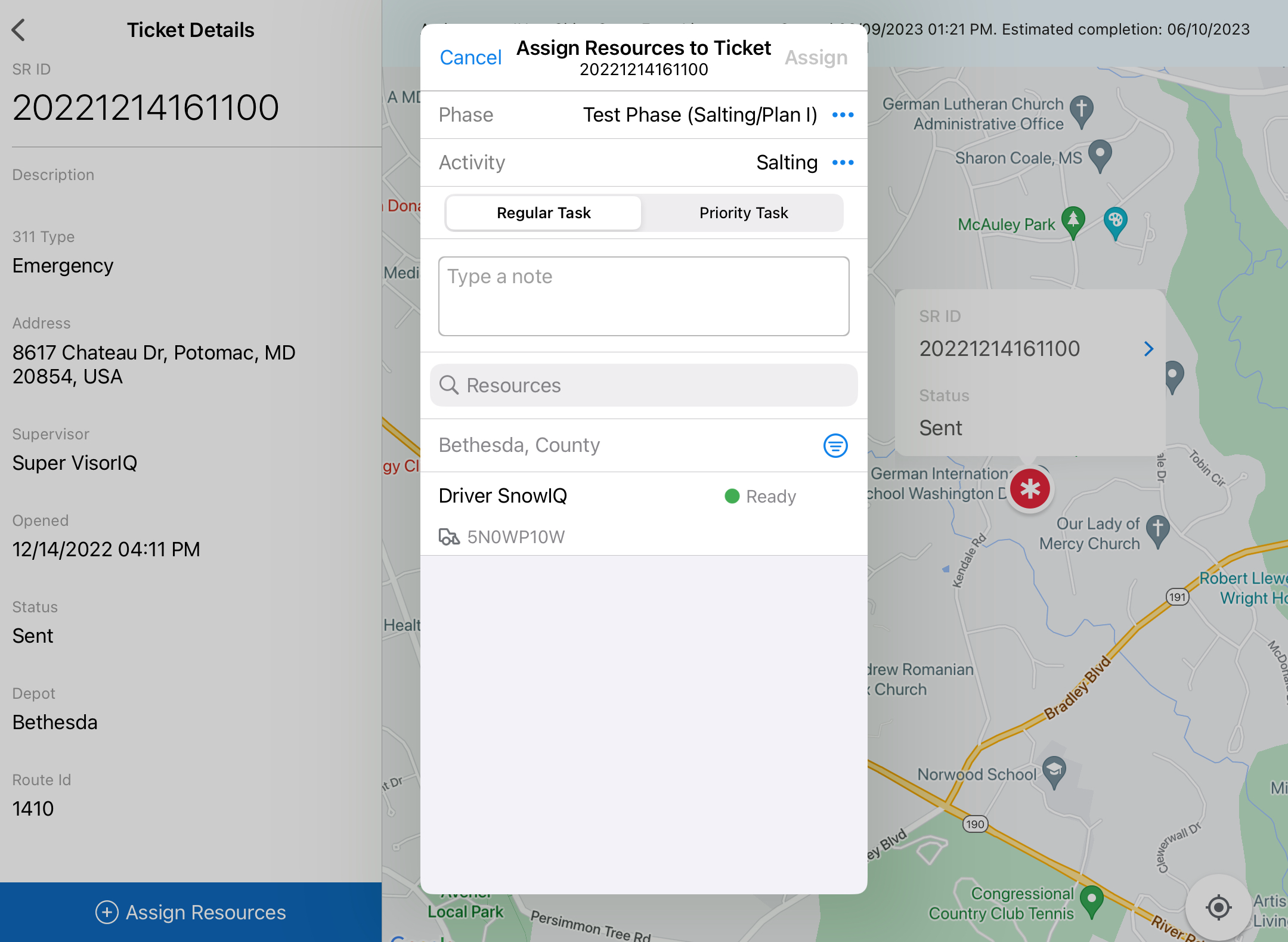 - From the Map Monitoring view (either tab: Routes, Resources, or Tickets), tap the magnifying glass or search bar and enter the address for the assignment