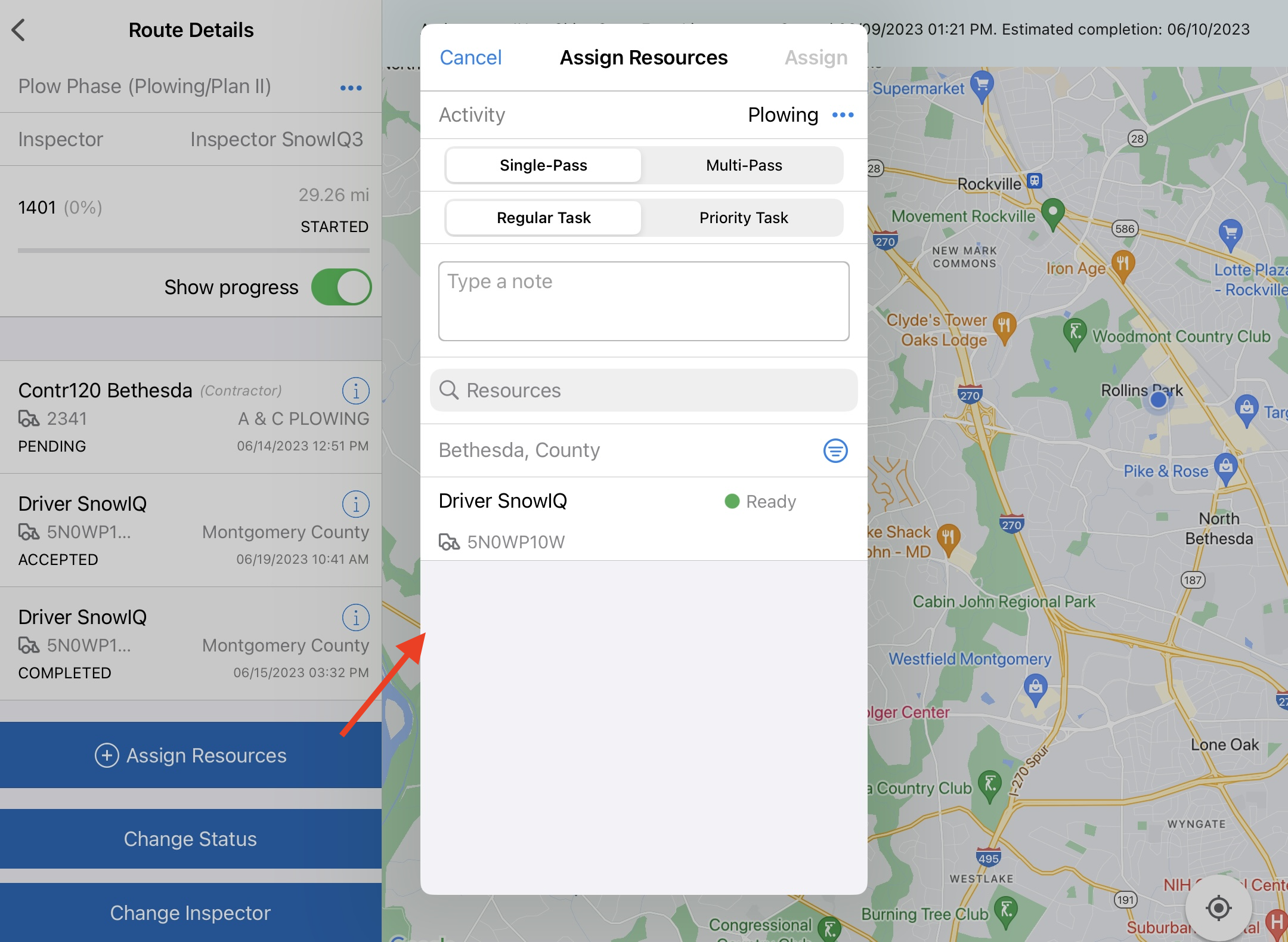 - From the ‘Routes Details’ panel, tap ‘Assign Resources’ as shown below.