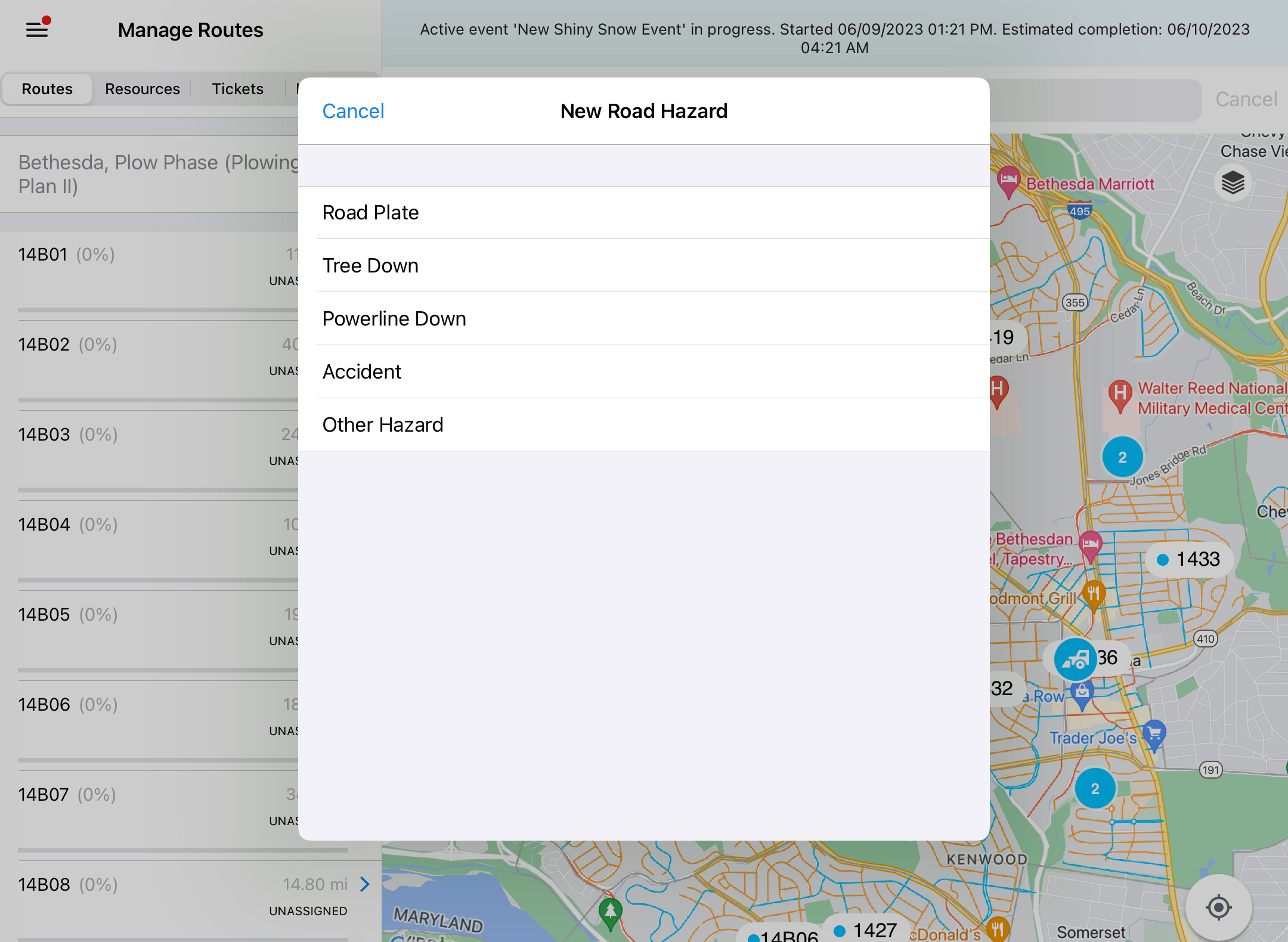 - From the Map Monitoring view (either tab: Routes, Resource, or Tickets), tap on the map where the road hazard is located