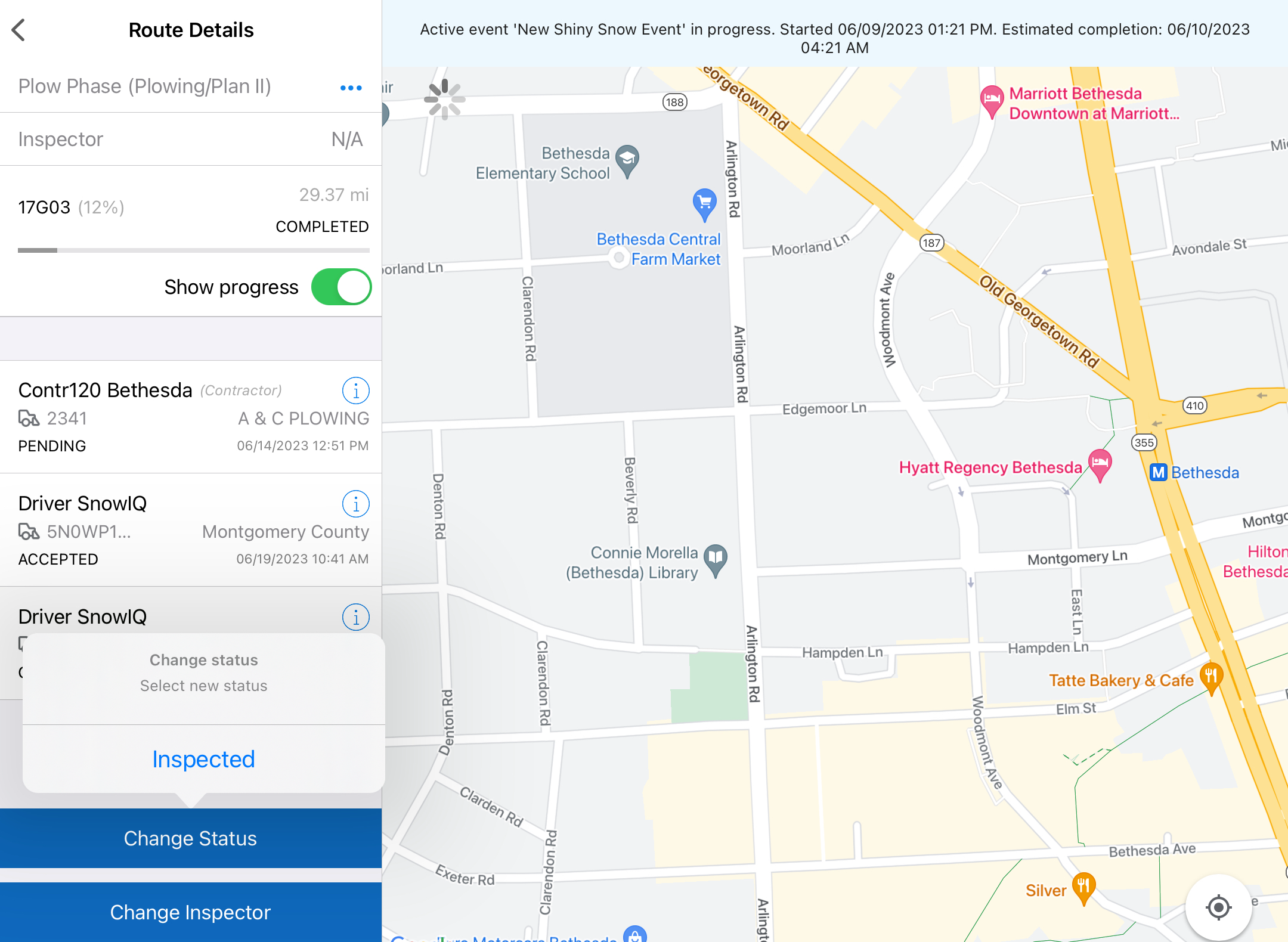 Once a Route has all its assignments completed, a Supervisor needs to change the status of that route to ‘Inspected’ to verify that the route is finished. To do this, navigate to the Route Details panel and select ‘Change Status’, and then select ‘Inspected’ on the prompt.