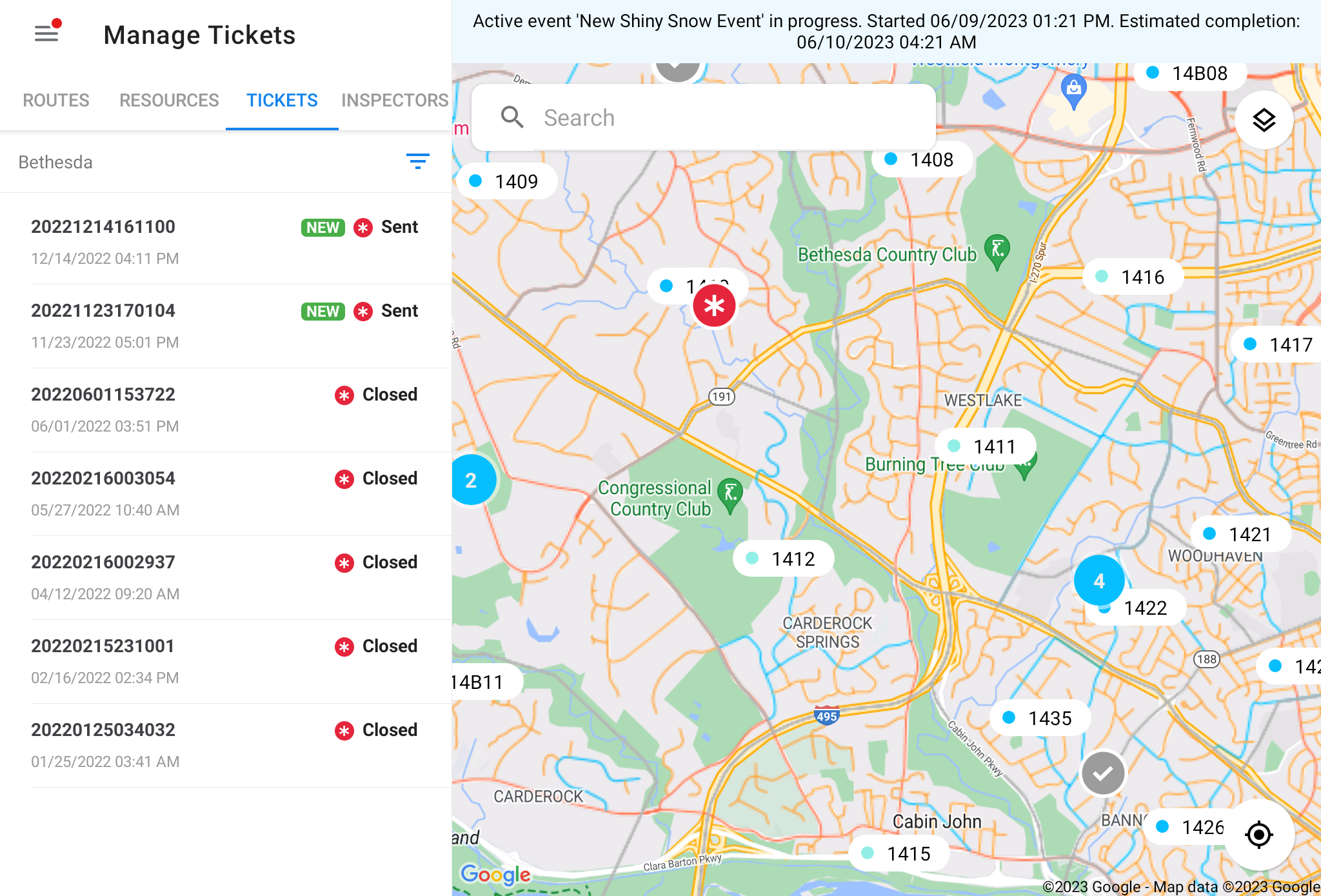 A new Ticket is notated with a ‘New’ tag and identified with a red asterisk marker on the map.. A checkmark on any type of ticket indicates that the ticket is closed.