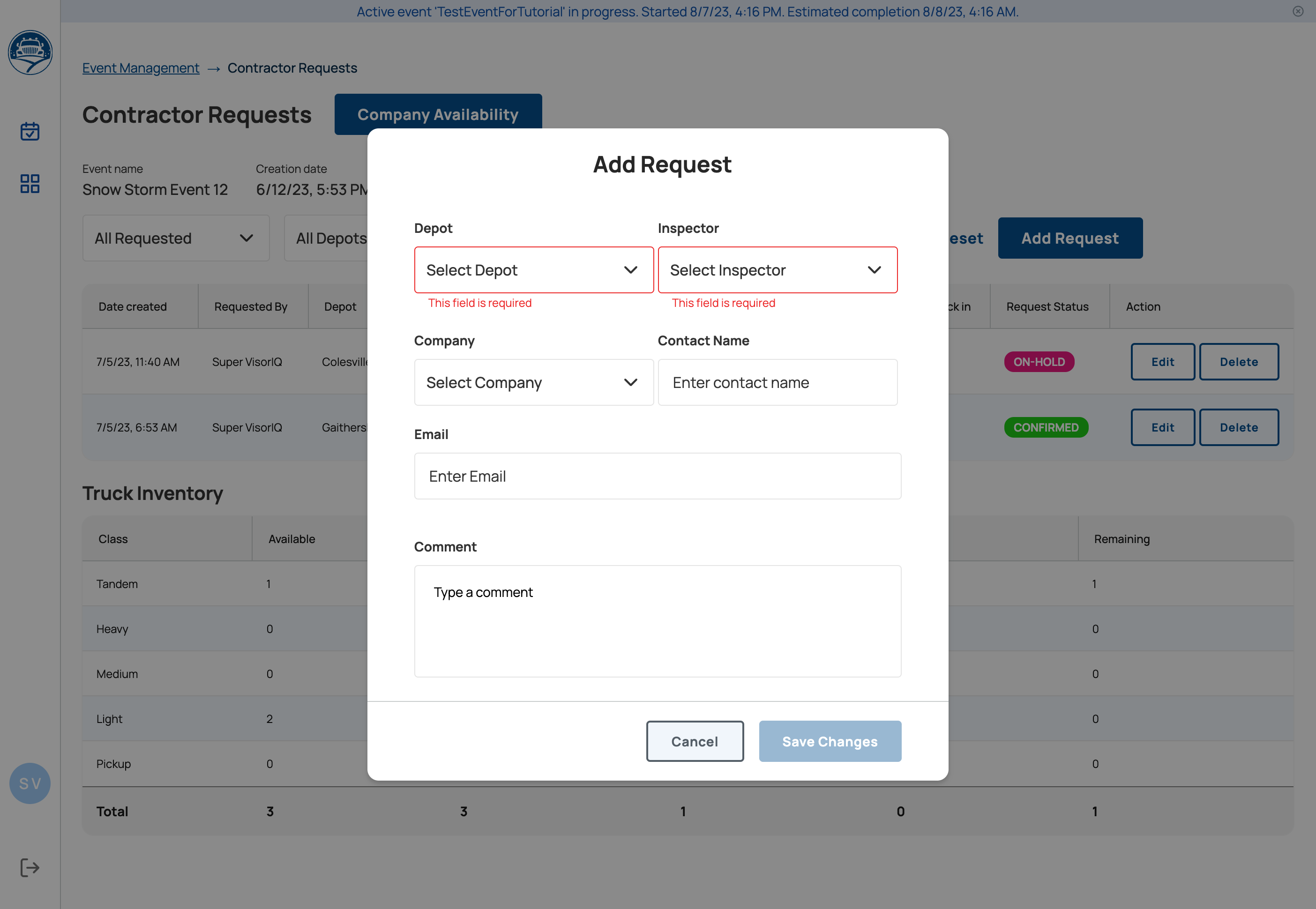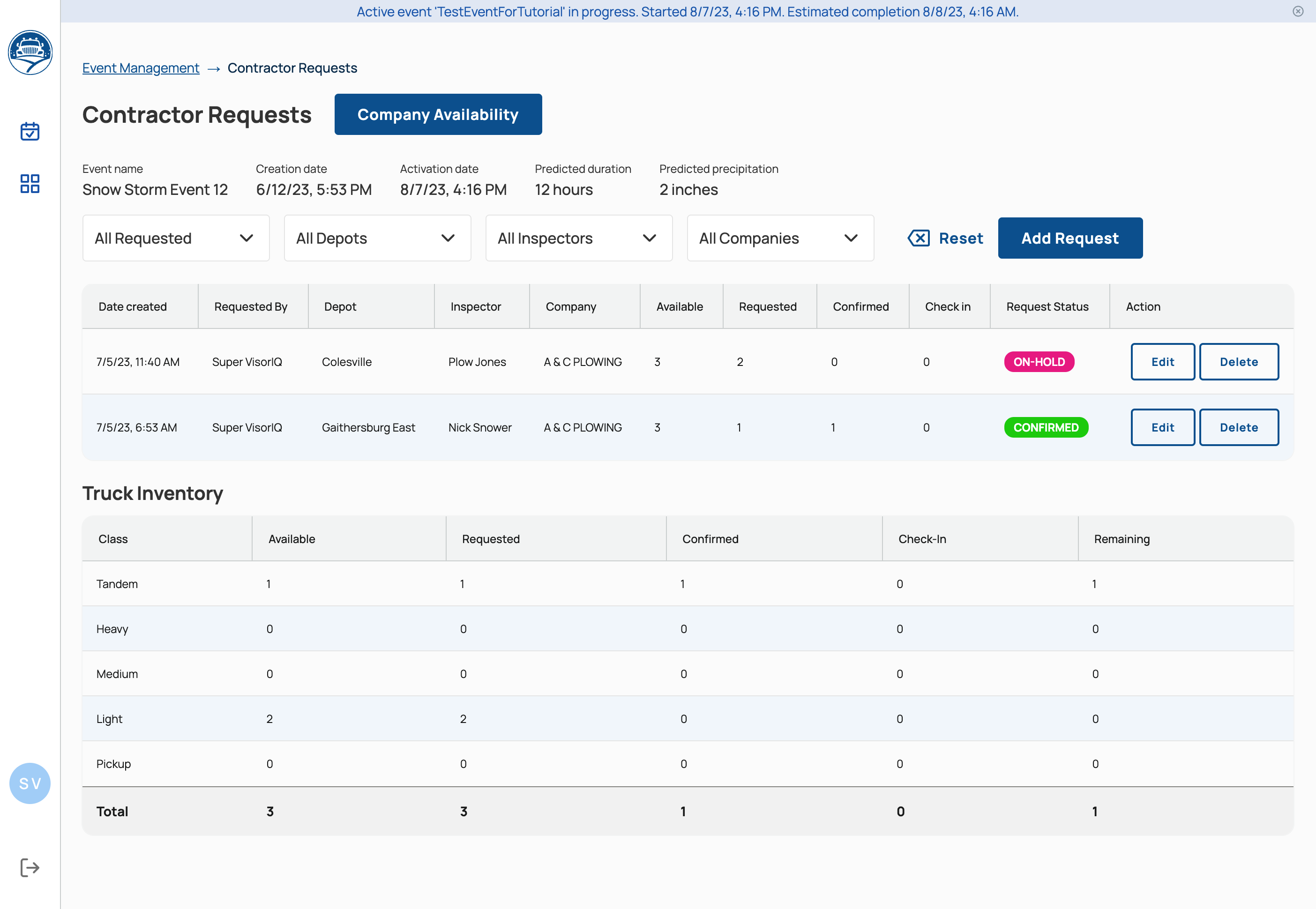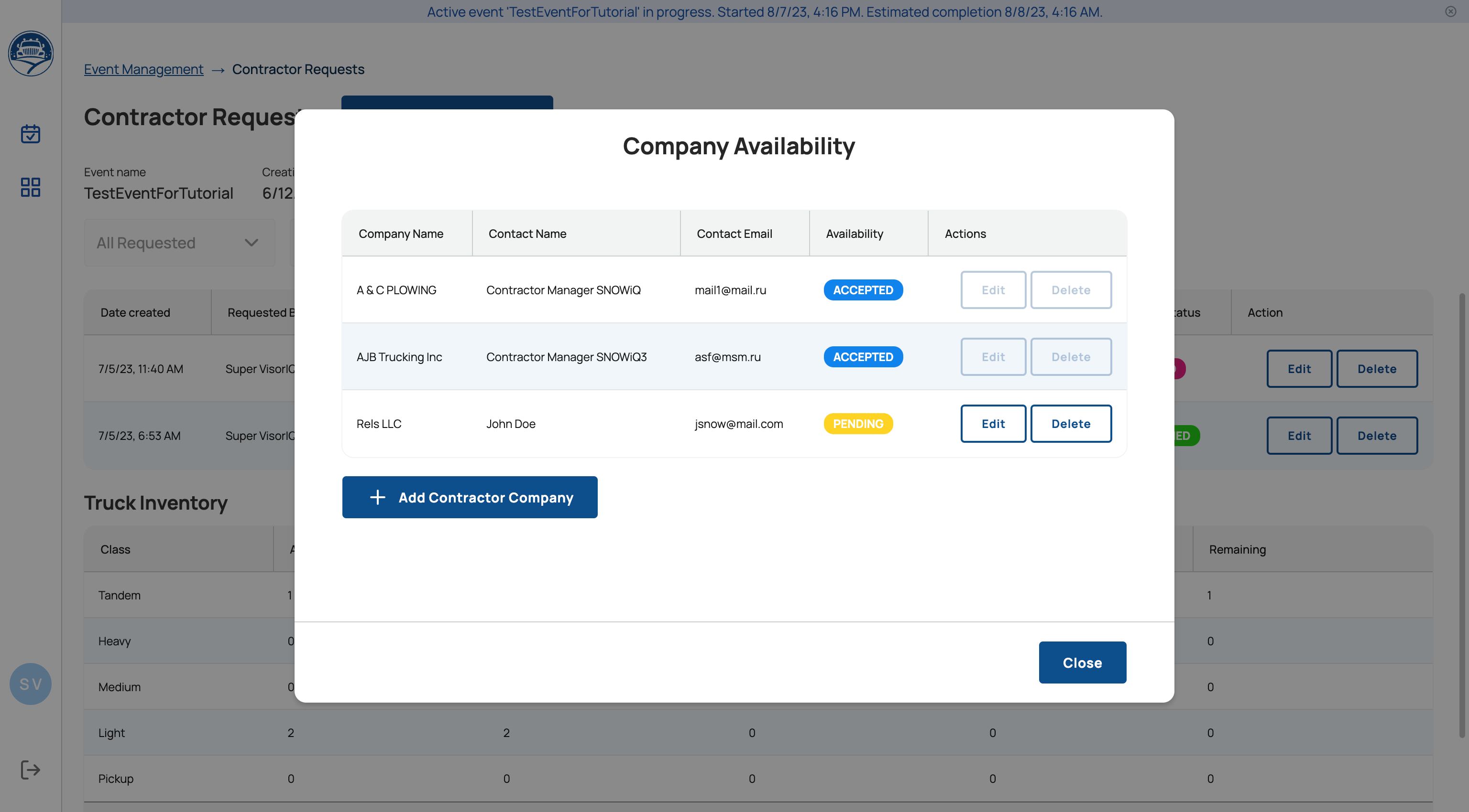 After a snowstorm event has been created, Admins and Supervisors can add contractor companies to support the event.