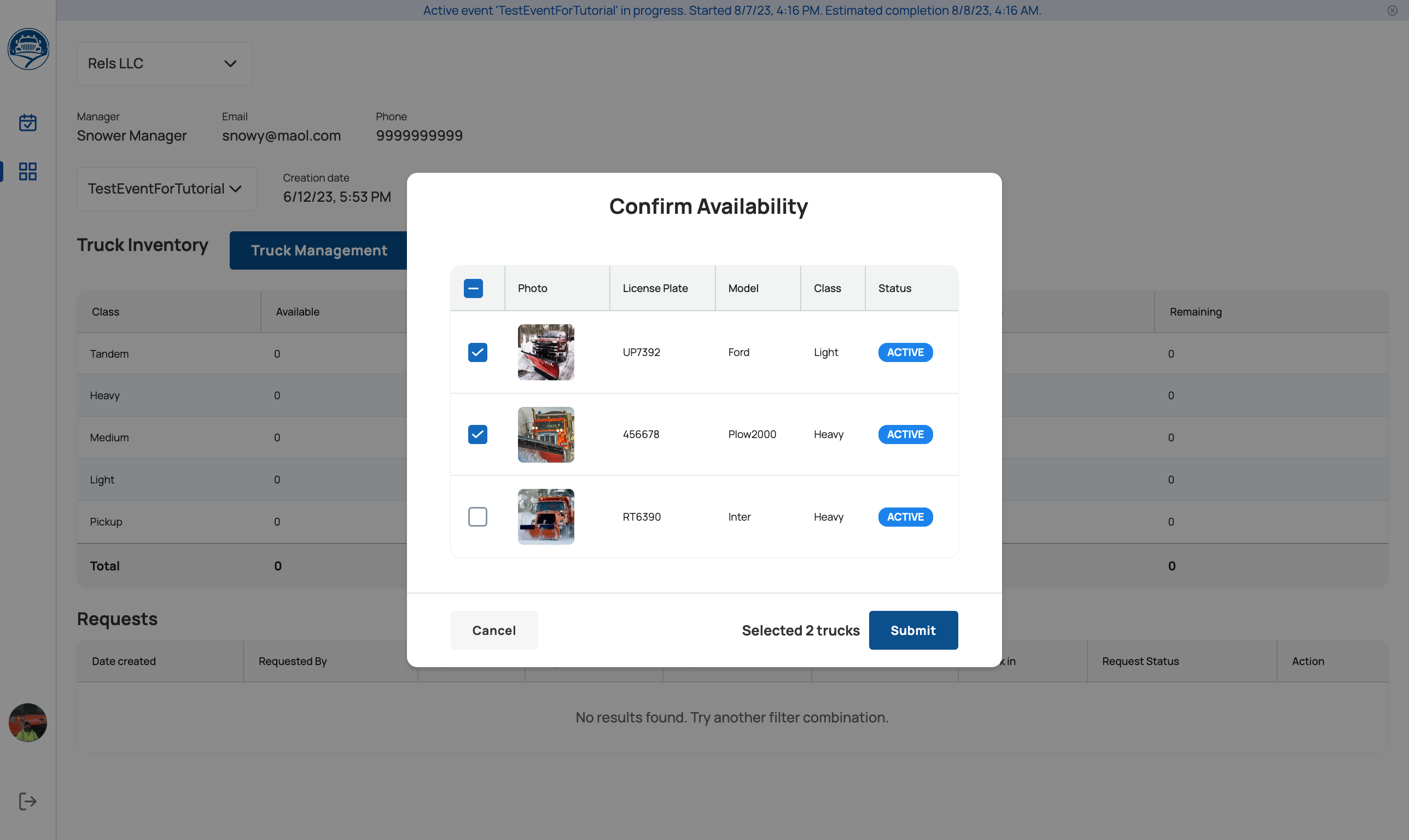 The company will be added to the event and its Contractor Manager will receive an email notification requesting information on a truck’s availability.